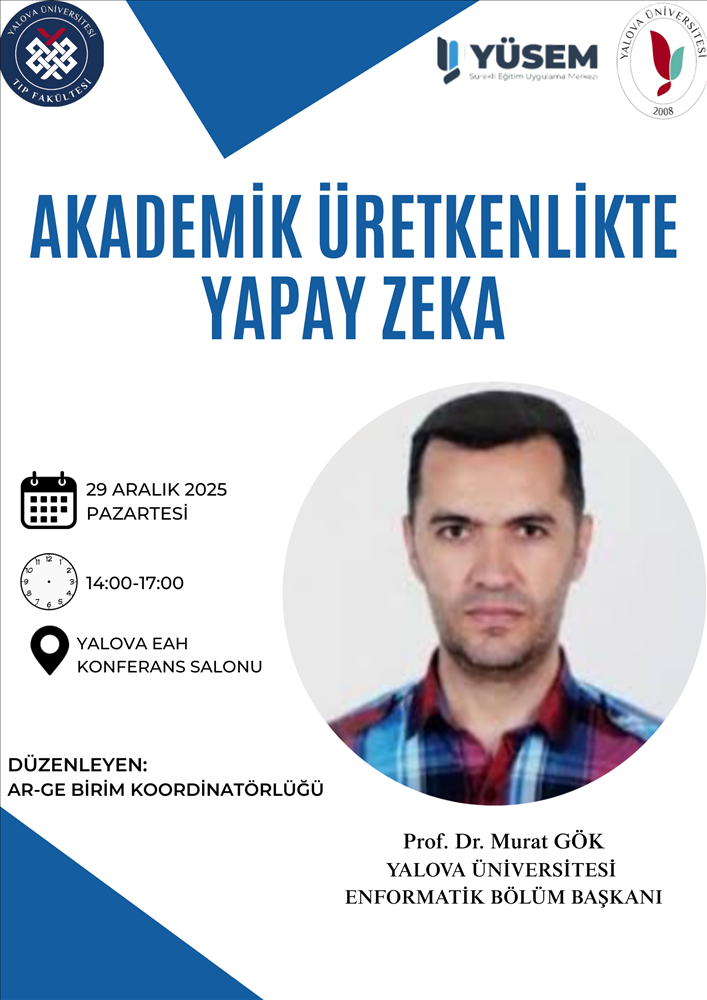 Yalova Üniversitesi Enformatik Bölüm Başkanı Prof. Dr. Murat GÖK tarafından, 29 Aralık 2025 Pazartesi günü Yalova Eğitim ve Araştırma Hastanesi Konferans Salonu’nda “Akademik Üretkenlikte Yapay Zekâ” başlıklı eğitim gerçekleştirilecektir.